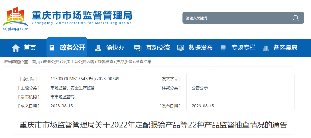 近日,重慶市市場(chǎng)監(jiān)督管理局網(wǎng)站發(fā)布關(guān)于2022年定配眼鏡產(chǎn)品等22種產(chǎn)品監(jiān)督抽查情況的通告。通告稱(chēng),按照相關(guān)規(guī)定,現(xiàn)將2022年定配眼鏡、照明電器、春夏裝、仿真飾品、防水涂料、童車(chē)、家用電器、童鞋、箱包、鋼筋機(jī)械連接用套筒、人造板、木質(zhì)門(mén)、磚和砌塊、普通混凝土小型砌塊、路面磚、塑料管材、消防產(chǎn)品、煙花爆竹、涂料、秋冬裝、鞋材、工具五金等22種產(chǎn)品監(jiān)督抽查情況予以公布。
