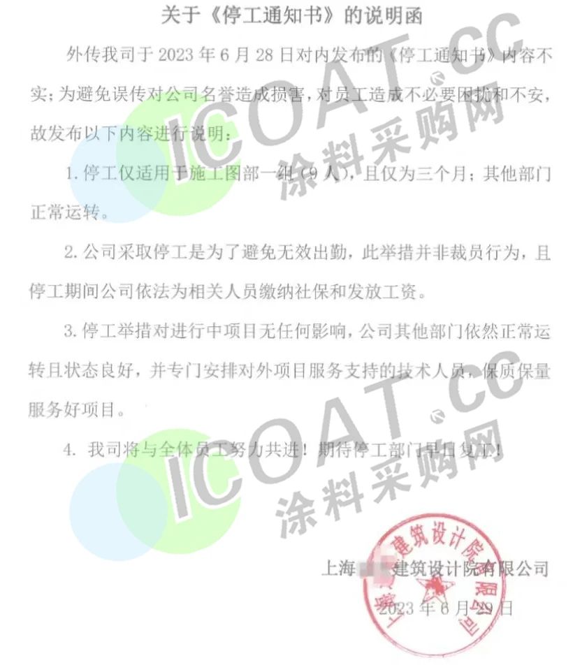 7月底,上海另一家建筑設計公司表示,由于資金緊張導致項目進入停止狀態,公司實際已暫停相關經營活動,決定自8月1日起開始停工停產。