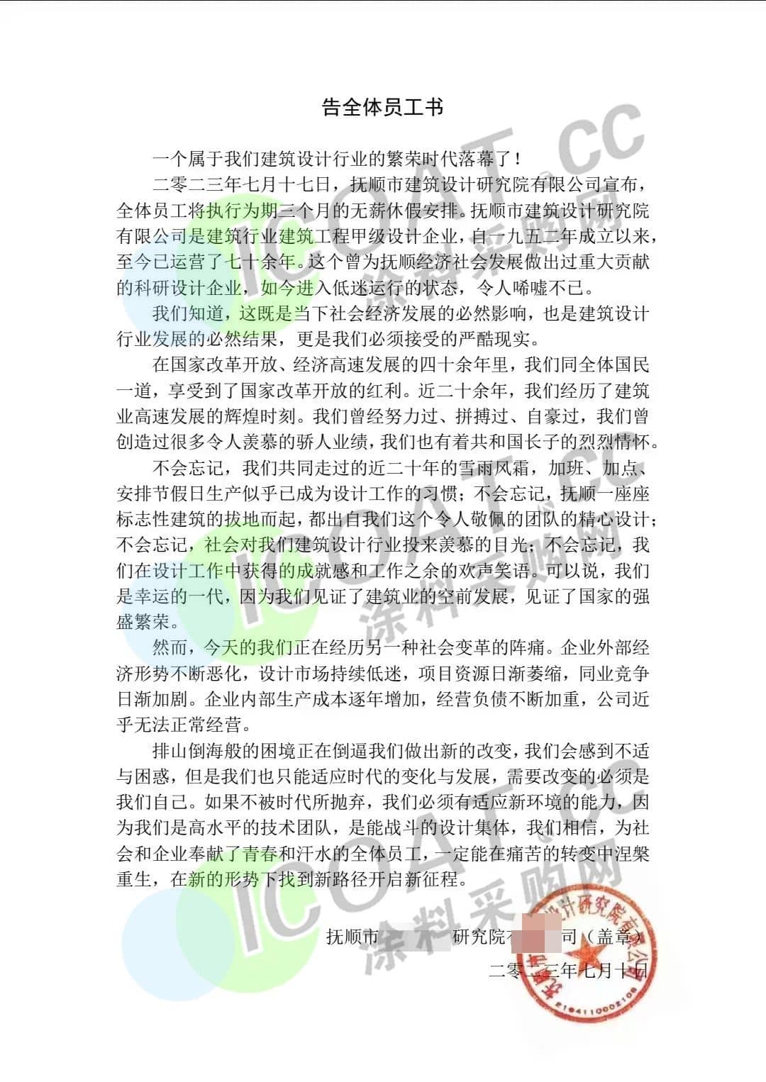 隨后,遼寧省某建筑設計研究院發布“告全體員工書”,稱“自2023年7月17日開始,全體員工將執行為期3個月的無薪休假安排。”休假原因則是,“外部經濟形勢不斷惡化,設計市場持續低迷,項目資源日漸萎縮,同行競爭日漸加劇。企業內部生產成本逐年增加,經營負債不斷加重,公司近乎無法正常經營。”這家70多年的老牌設計院言語中透露出,建筑設計行業的繁榮時代落幕了。