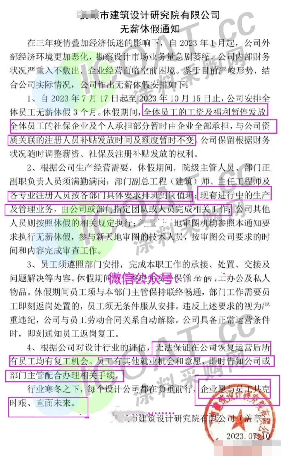 事實上,關于設計院的負面消息,在2023年屢被曝出,無薪放假、停工停業、欠薪停繳社保、鼓勵停薪留職……先是6月底上海某建筑設計院發布停工通知書,稱從6月28日起開始全體員工停工停產三個月。