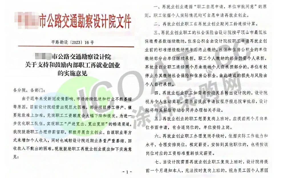 某網友曬出河南平頂山某設計院的《關于支持和鼓勵內部職工再就業創業的實施意見》紅頭文件。目前設計院經營出現巨大困難,部分項目停工停產、催要賬款難上加難,無崗職工工資額度會大幅下降和緩發。該院鼓勵職工辦理停薪留職,積極開展自主創業、自謀職業等方式來增加個人收入,同時也減輕設計院近期業務量嚴重萎縮、回收款入不敷出的困難。