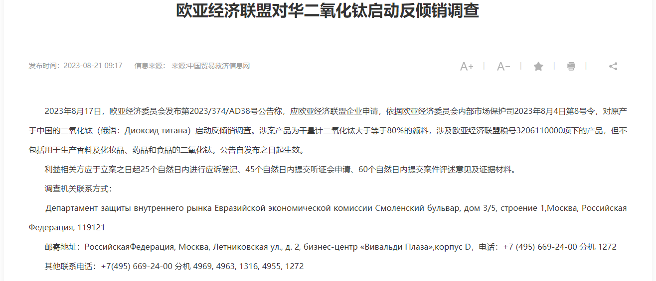 近日,歐亞經(jīng)濟(jì)委員會(huì)發(fā)布第2023/374/AD38號(hào)公告稱,應(yīng)歐亞經(jīng)濟(jì)聯(lián)盟企業(yè)申請(qǐng),依據(jù)歐亞經(jīng)濟(jì)委員會(huì)內(nèi)部市場(chǎng)保護(hù)司2023年8月4日第8號(hào)令,對(duì)原產(chǎn)于中國(guó)的二氧化鈦(俄語(yǔ):Диоксид титана)啟動(dòng)反傾銷調(diào)查。涉案產(chǎn)品為干量計(jì)二氧化鈦大于等于80%的顏料,涉及歐亞經(jīng)濟(jì)聯(lián)盟稅號(hào)3206110000項(xiàng)下的產(chǎn)品,但不包括用于生產(chǎn)香料及化妝品、藥品和食品的二氧化鈦。公告自發(fā)布之日起生效。