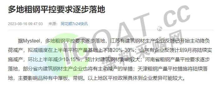 近日,多地粗鋼平控要求逐步落地。江蘇有建筑鋼材生產(chǎn)企業(yè)反饋已開始主動(dòng)降負(fù)荷減產(chǎn),擬減幅度在上半年平均產(chǎn)量基礎(chǔ)上下降20%-30%;山東有企業(yè)反饋計(jì)劃9月將陸續(xù)實(shí)施減產(chǎn),環(huán)比上半年減少10-15%,河南部分省內(nèi)建筑鋼材生產(chǎn)企業(yè)也將有主動(dòng)減產(chǎn)的舉措;天津粗鋼產(chǎn)量平控措施將陸續(xù)落地,主要影響品種有中厚板、帶鋼。