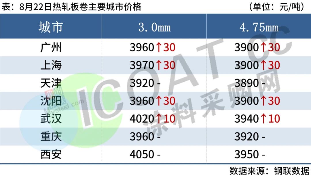 熱軋板卷市場(chǎng),全國(guó)24個(gè)主要城市4.75mm熱軋板卷均價(jià)3955元/噸,較上個(gè)交易上漲7元/噸。