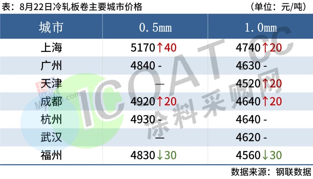 冷軋板卷市場(chǎng),全國(guó)24個(gè)主要城市1.0mm冷卷均價(jià)4643元/噸,較上個(gè)交易日上漲1元/噸。
