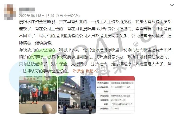 晨陽水漆的糾紛遠不止是關聯的卓融基金,還包括供應商的貨款和前員工的工資。自2020年開始,就曾出現多人聚集在晨陽水漆科技園北門和徐水縣有關部門門口進行“討債”的情況,而后陸續有網友在社交平臺訴苦,但仍未推動事情向有利的方向發展。