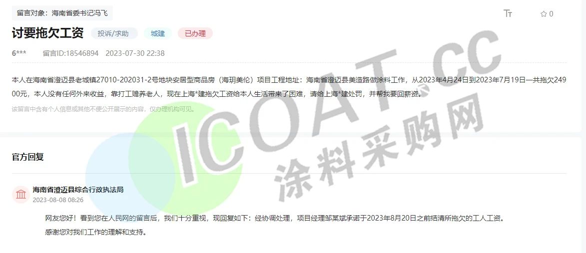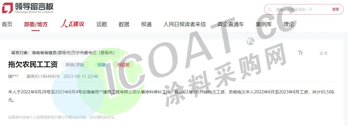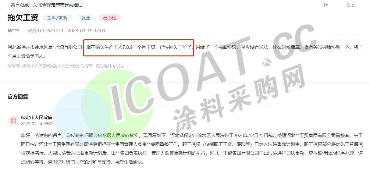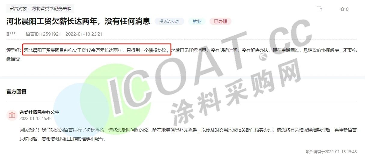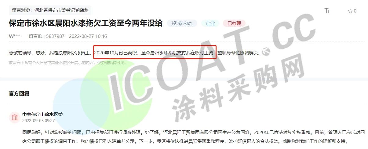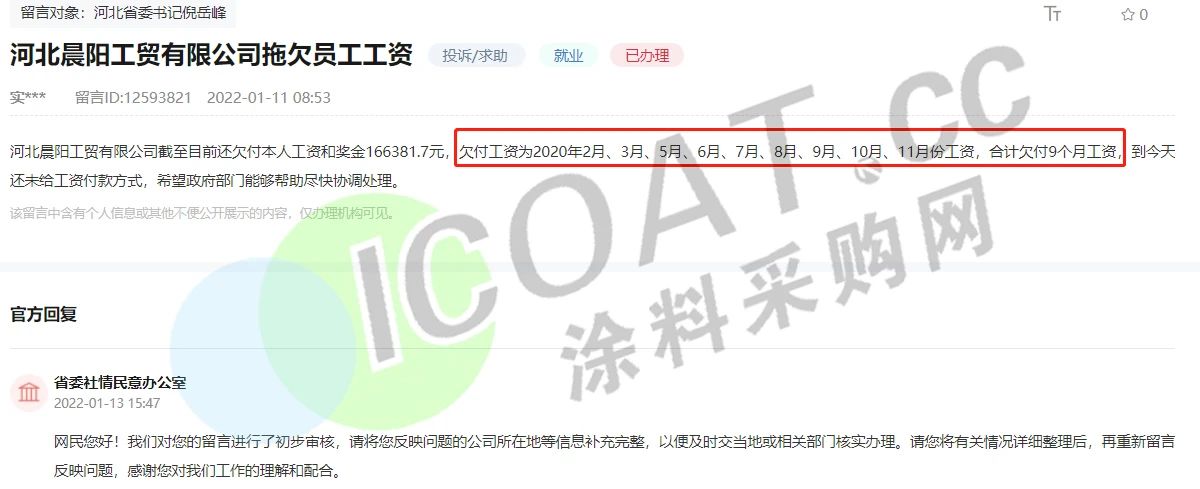 在人民網領導留言板平臺,不少網友自述是原晨陽水漆員工,“控訴”離職后已經過了幾年,企業卻仍未支付其在職時的工資。回應中的“依照訴訟的程序辦理,請您耐心等待”卻沒能讓這些被拖欠了工資的人得到一絲心安。