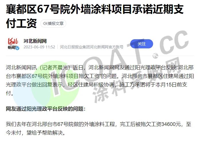 河北網友反映“河北邢臺市襄都區67號院外墻涂料項目拖欠工資”。