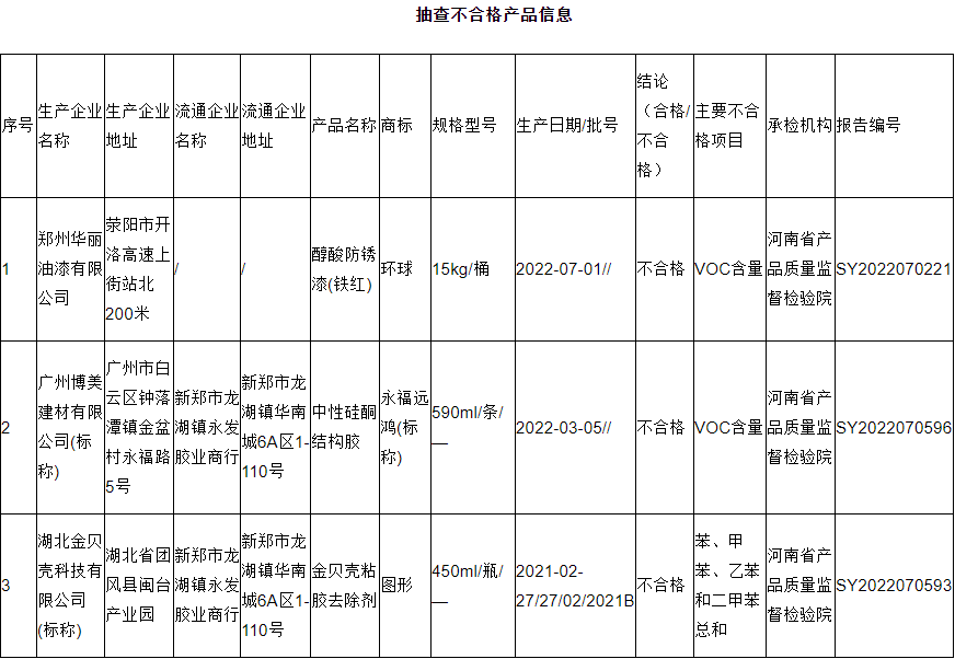 揮發性有機物產品質量監督抽查包括建筑用涂料、工業涂料、膠粘劑、內外墻膩子、清洗劑、道路標志涂料、油漆、油墨等8種產品。其中,檢出1批次工業涂料、1批次膠粘劑和1批次清洗劑產品不合格,主要不合格項目為苯、甲苯、乙苯和二甲苯總和、VOC含量項目。經技術機構分析,不合格的主要原因:
