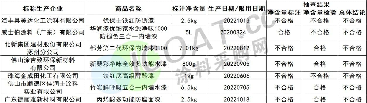 除此之外,知名涂料企業威士伯涂料、北新建材等因凈含量標注或凈含量檢驗不合格,最終被標記為“不合格”。