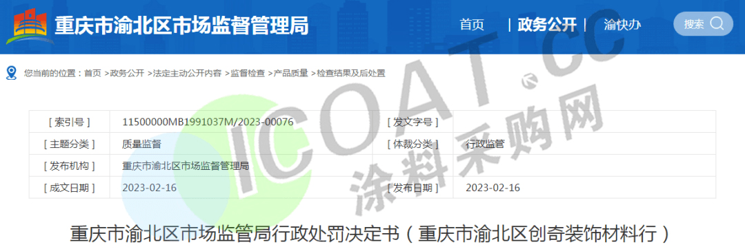 重慶市市場監督管理局“重慶市渝北區創奇裝飾材料行”銷售的防水涂料進行質量監督抽查。經抽樣檢驗,斷裂伸長率(無處理)、斷裂伸長率(加熱處理)不符合GB/T 23445-2009標準,沒收不合格的防水涂料2桶,沒收違法所得260.00元,罰款540.00元。