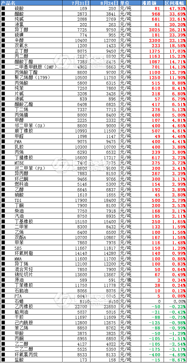其中,硫酸、醋酸、純堿、液氯近一個月漲幅達30%以上,異丁醇、辛醇、正丁醇、丙二醇、醋酸丁酯漲跌額也超1000元/噸。