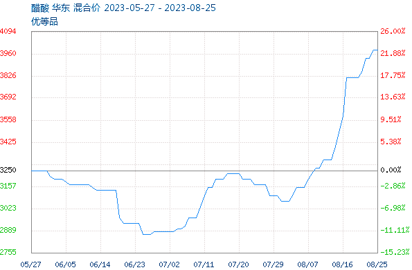 自8月份開始國內(nèi)醋酸市場行情持續(xù)在上行通道。這主要是受到成本支撐增強,供需利好的提振。其中,成本面上,上游原料甲醇市場行情表現(xiàn)偏強,成本上漲。供應(yīng)方面,6-7月份主力企業(yè)的裝置陸續(xù)檢修,且其他企業(yè)故障頻發(fā),從而導(dǎo)致市場供應(yīng)緊張。需求方面,主力下游新增產(chǎn)能集中釋放,利好醋酸市場需求。