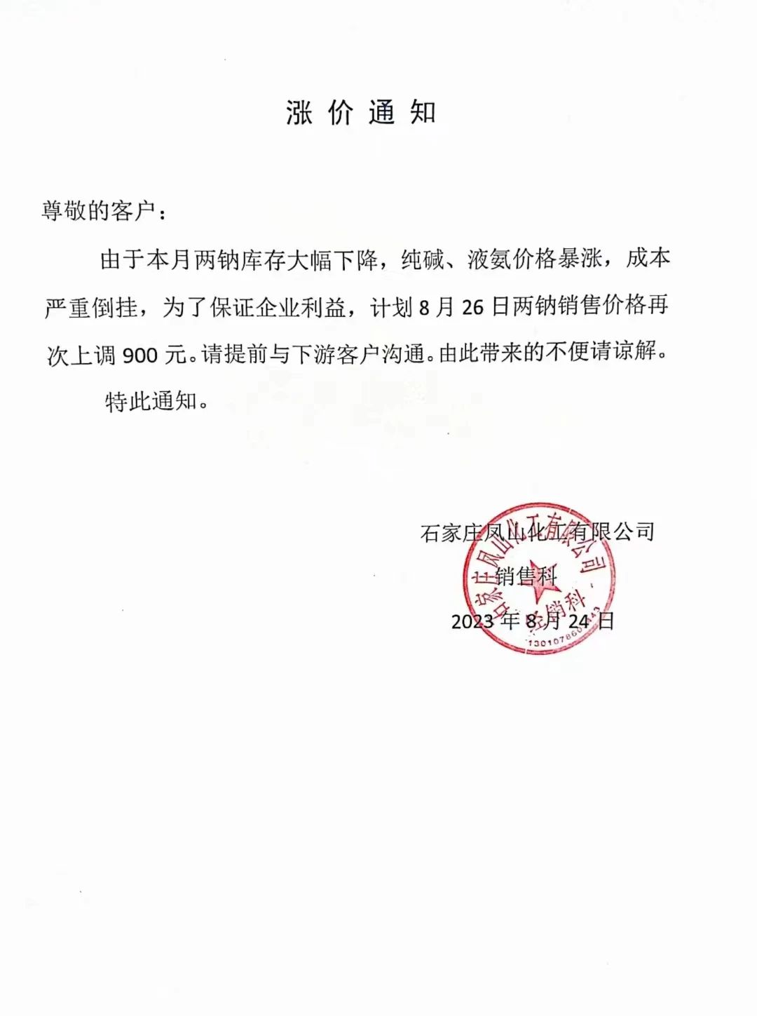石家莊鳳以化奇有限公司表示,由于本月兩鈉庫存大幅下降,純堿、液氨價格暴漲,成本嚴重倒掛,為了保證企業(yè)利益,計劃8月26日兩銷售價格再次上調(diào)900 元。