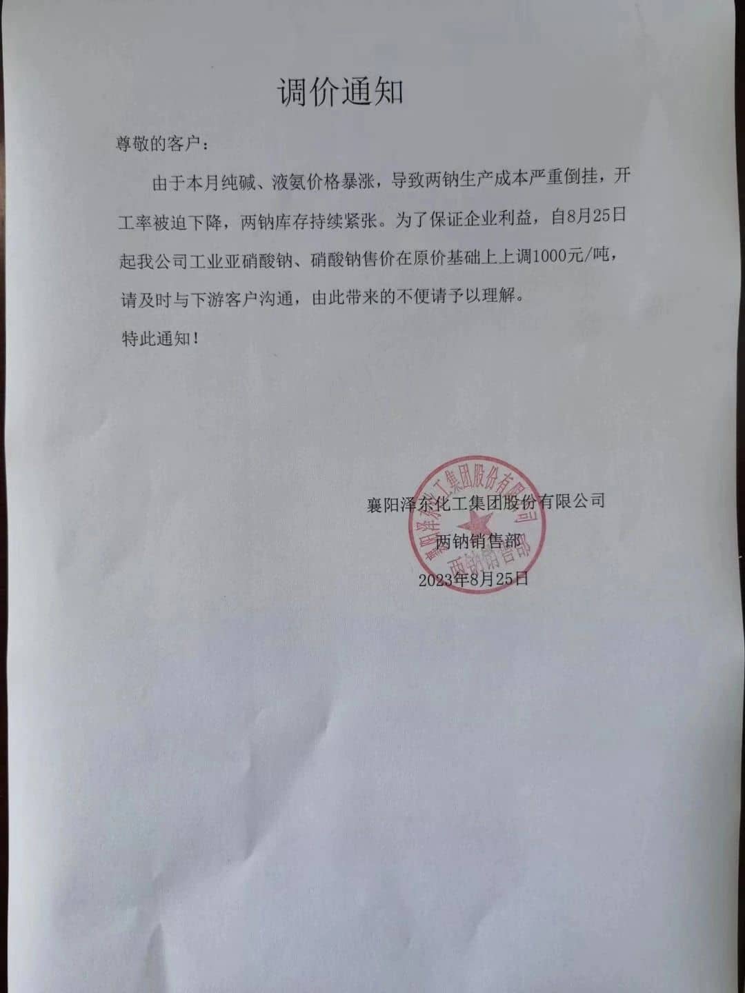 襄陽澤東化工集團股份有限公司表示,由于本月純堿、液氨價格暴漲,導(dǎo)致兩鈉生產(chǎn)成本嚴重倒掛,開工率被迫下降,兩鈉庫存持續(xù)緊張。為了保證企業(yè)利益,自8月25日起我公司工業(yè)亞硝酸鈉、硝酸鈉售價在原價基礎(chǔ)上上調(diào)1000元/噸。
