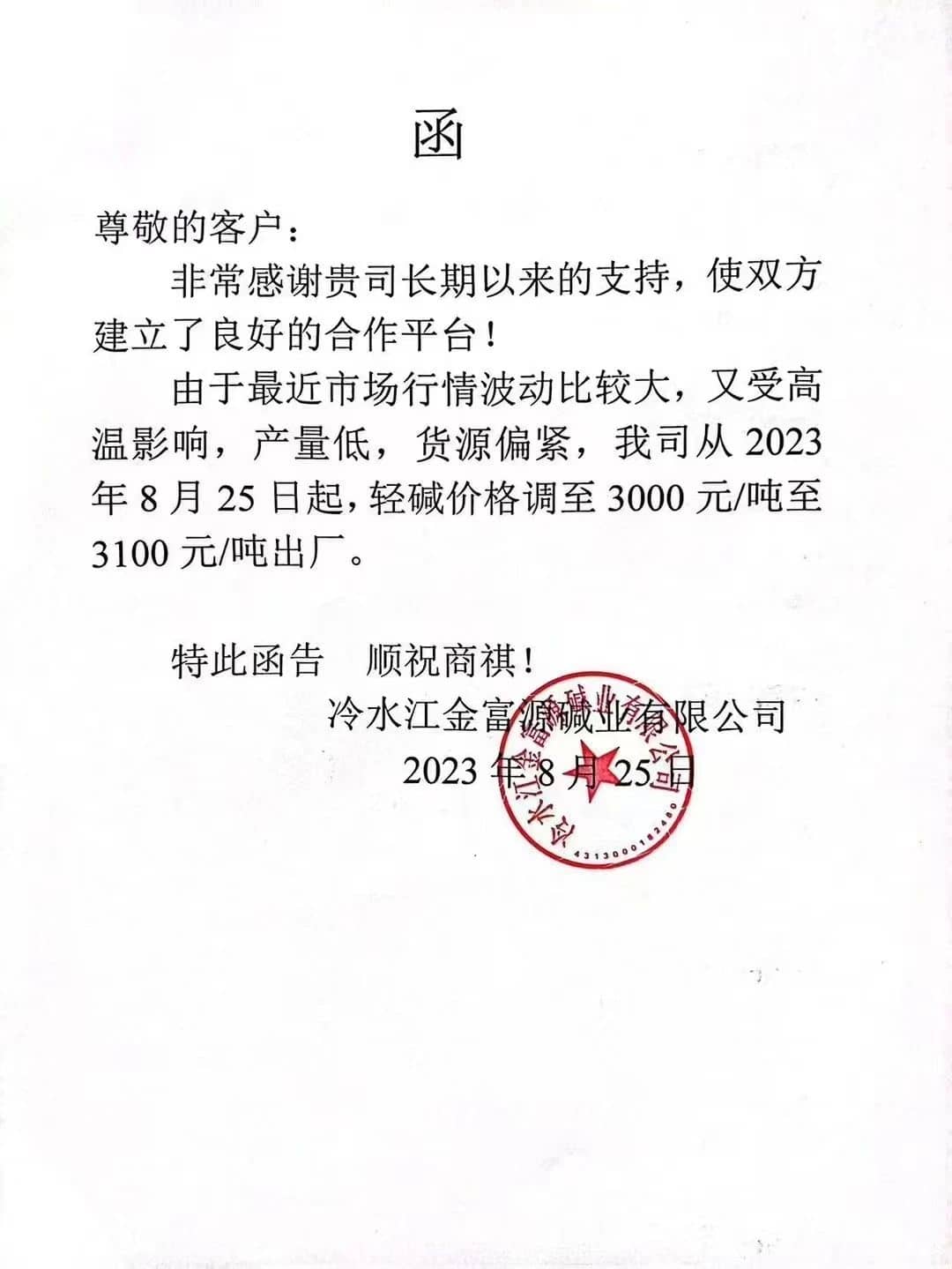 冷水江金富源堿業(yè)有限公司表示,由于最近市場行情波動比較大,又受高溫影響,產(chǎn)量低,貨源偏緊,我司從2023年8月25日起,輕堿價格調(diào)至3000元/噸至3100元/噸出廠。