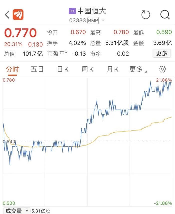 值得一提的是,中國恒大股價(jià)在9月11日大漲超20%,截至收盤,漲20.31%,報(bào)0.77港元/股,總市值達(dá)101.7億港元。