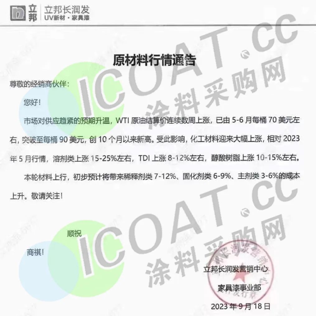 近日,立邦長潤發營銷中心家具漆事業部發布了一則《原材料行情通告》,稱市場對供應趨緊的預期升溫,WTI原油結算價連續數周上漲,已由5-6月每桶70美元左右,突破至每桶90美元,創10個月以來新高。受此影響,化工材料迎來大幅上漲,相對2023年5月行情,溶劑類上漲15-25%左右,TDI上漲8-12%左右,醇酸樹脂上漲10-15%左右。本輪材料上行,初步預計將帶來稀釋劑類7-12%、固化劑類6-9%、主劑類3-6%的成本上升。