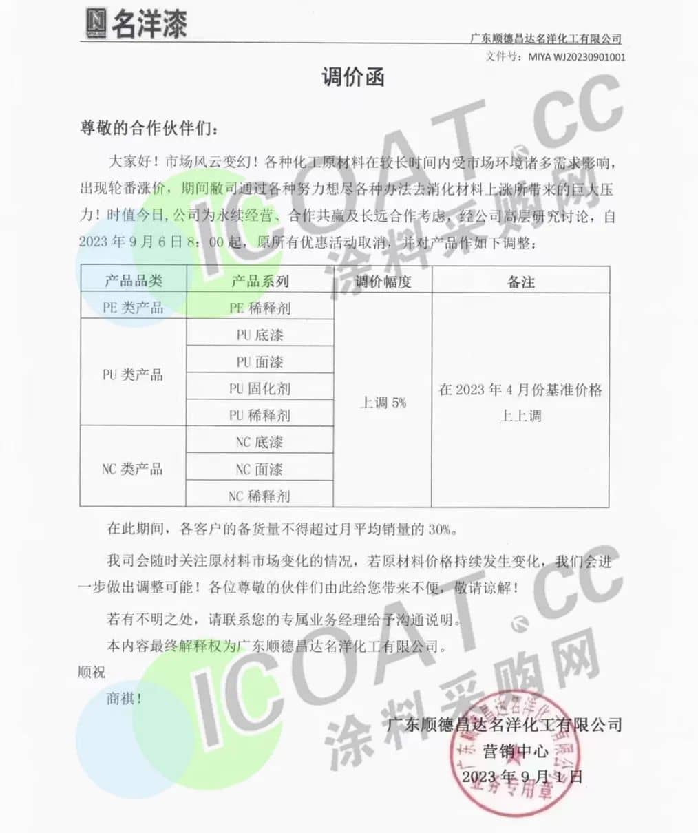 名洋漆發布調價函稱,各種化工原材料在較長時間內受市場環境諸多需求影響,出現輪番漲價,期間敝司通過各種努力想盡各種辦法去消化材料上漲所帶來的巨大壓力!經高層研究討論,自9月6日8:00起,原所有優惠活動取消,并對PE類產品、PU類產品、NC類產品在2023年4月份基準價格上上調5%。并明確,各客戶的備貨量不得超過月平均銷量的30%,不排除后續進一步調價的可能。