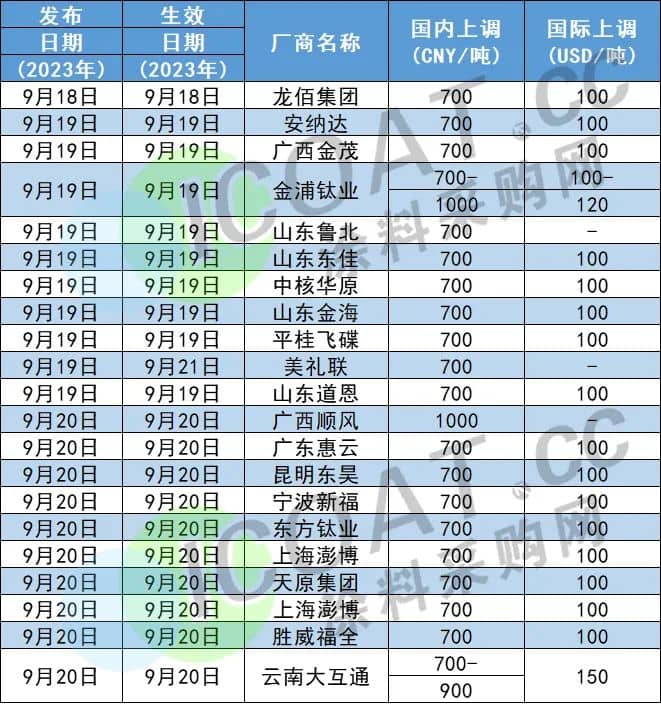 龍佰鈦業、安納達、道恩鈦業、東方鈦業、金茂鈦業、惠云鈦業、金海鈦業、平桂飛碟等20多家鈦白粉企業掀起年內第6輪漲價潮,鈦白粉廠家生產成本居高不下,國慶節前夕部分企業限產、運輸不暢,刺激了下游廠家集中補充庫存。另外由于9、10月終端季節消費尚可,多數廠家前期預收訂單充足,趕單交貨狀態持續,漲價意愿較為強烈。
