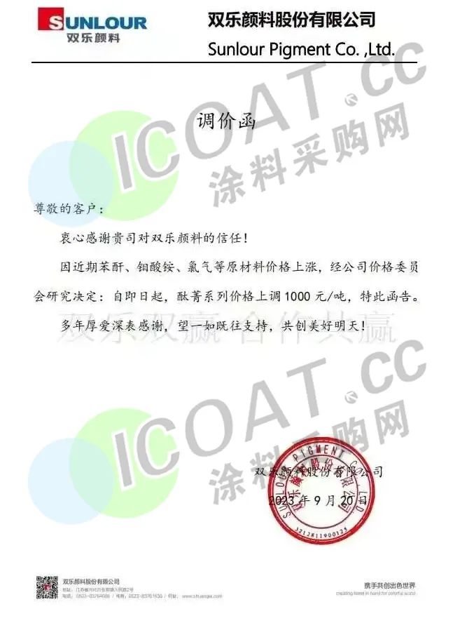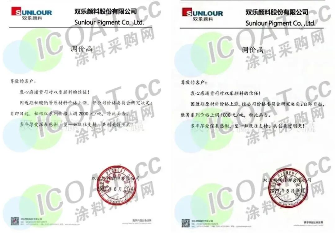 顏料行業,雙樂顏料在近2個月內連發3封漲價函,鉬鉻紅產品價格上調2000元/噸,酞菁系列產品價格2次累計上調2000元/噸。