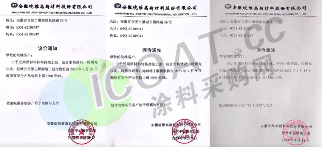 安徽皖維高新材料連發3份漲價函表示,聚乙烯醇縮丁醛樹脂粉8月29日上漲1500元/噸,9月9日起上漲2000元/噸,9月15日8時起上漲1500元/噸。