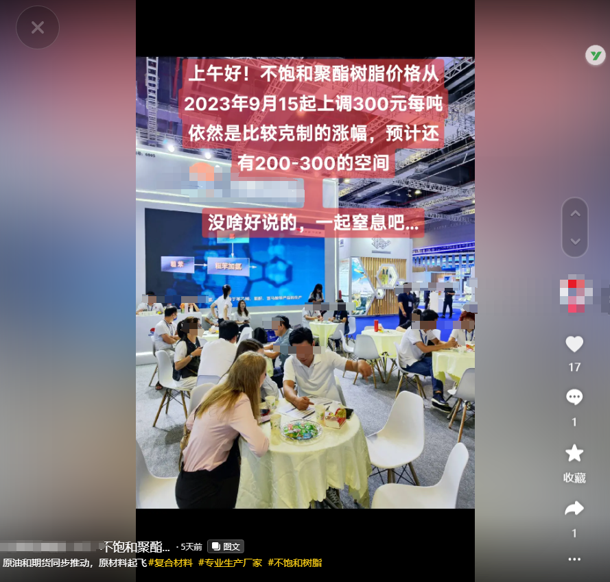 某聚酯樹脂生產商表示,原油和期貨同步推動,原材料起飛。不飽和聚酯樹脂價格從9月15日起上調300元/噸,預計還有200-300元的(上漲)空間。