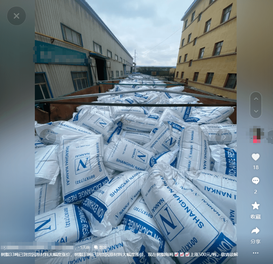 某生產商表示,因原材料大幅漲價,樹脂上漲500元/噸。