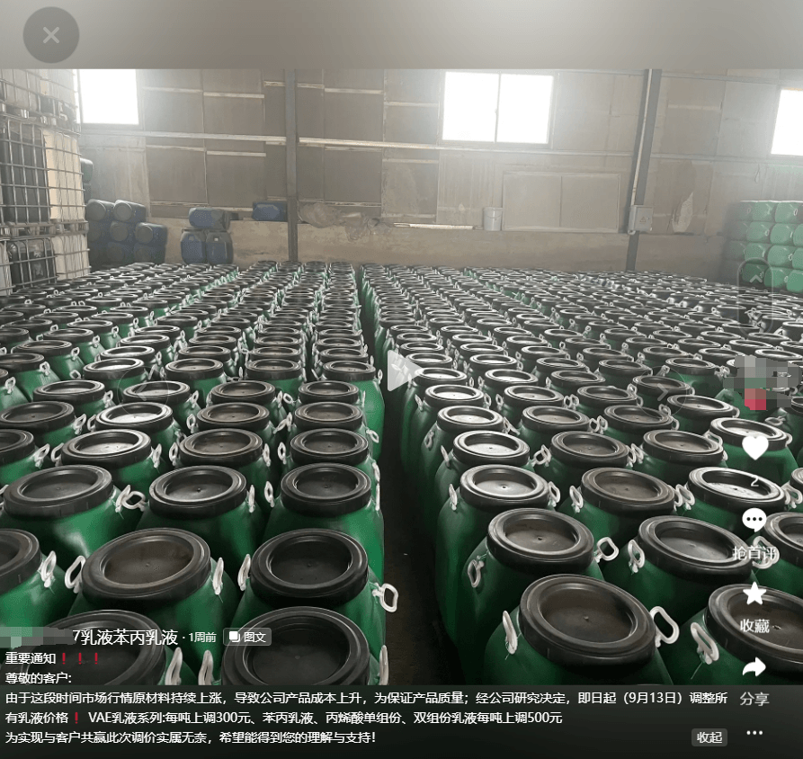 某苯丙乳液企業通知,9月13日調整所有乳液價格,VAE乳液上調300元/噸,苯丙乳液、丙烯酸單組份、雙組份乳液上調500元/噸。