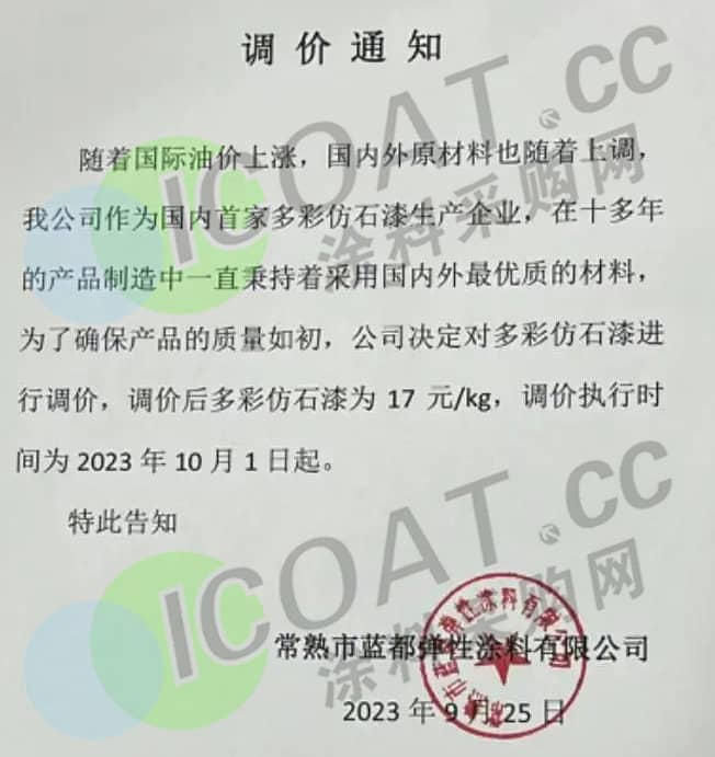 常熟市藍都彈性涂料:決定對多彩仿石漆進行調價,調價后多彩仿石漆為17 元/kg,調價執行時間為2023年10月1日起。