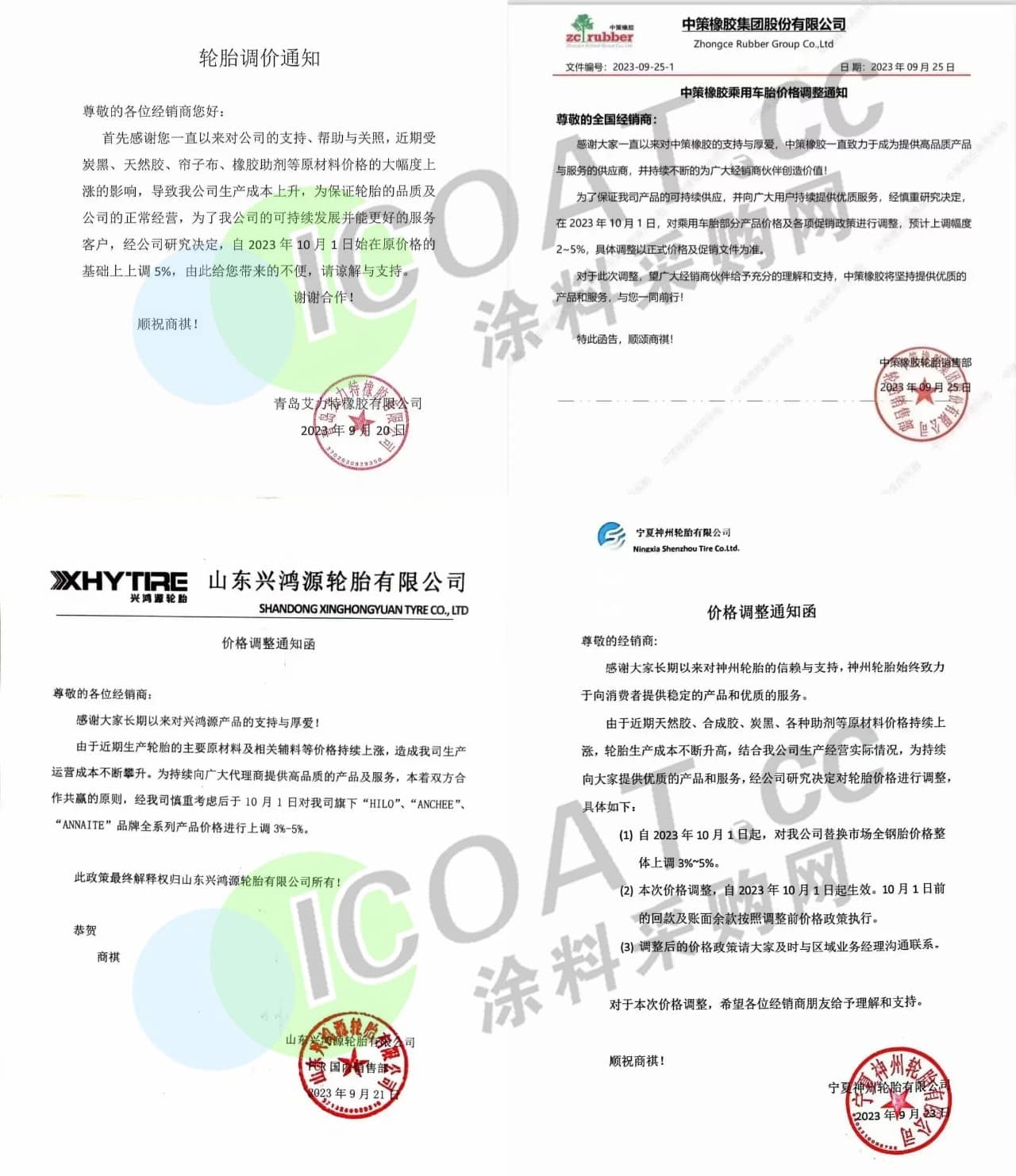 山東興鴻源輪胎:10月1日起,將對旗下“HILO”、“ANCHEE”、“ANNAITE”品牌全系列產品價格進行上調3%-5%。