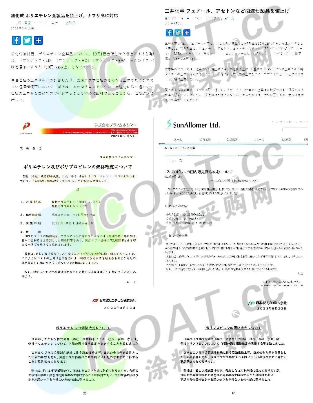 SunAllomerLtd.株式會社:自10月起上調公司所有PP產品的價格20日元/kg以上。