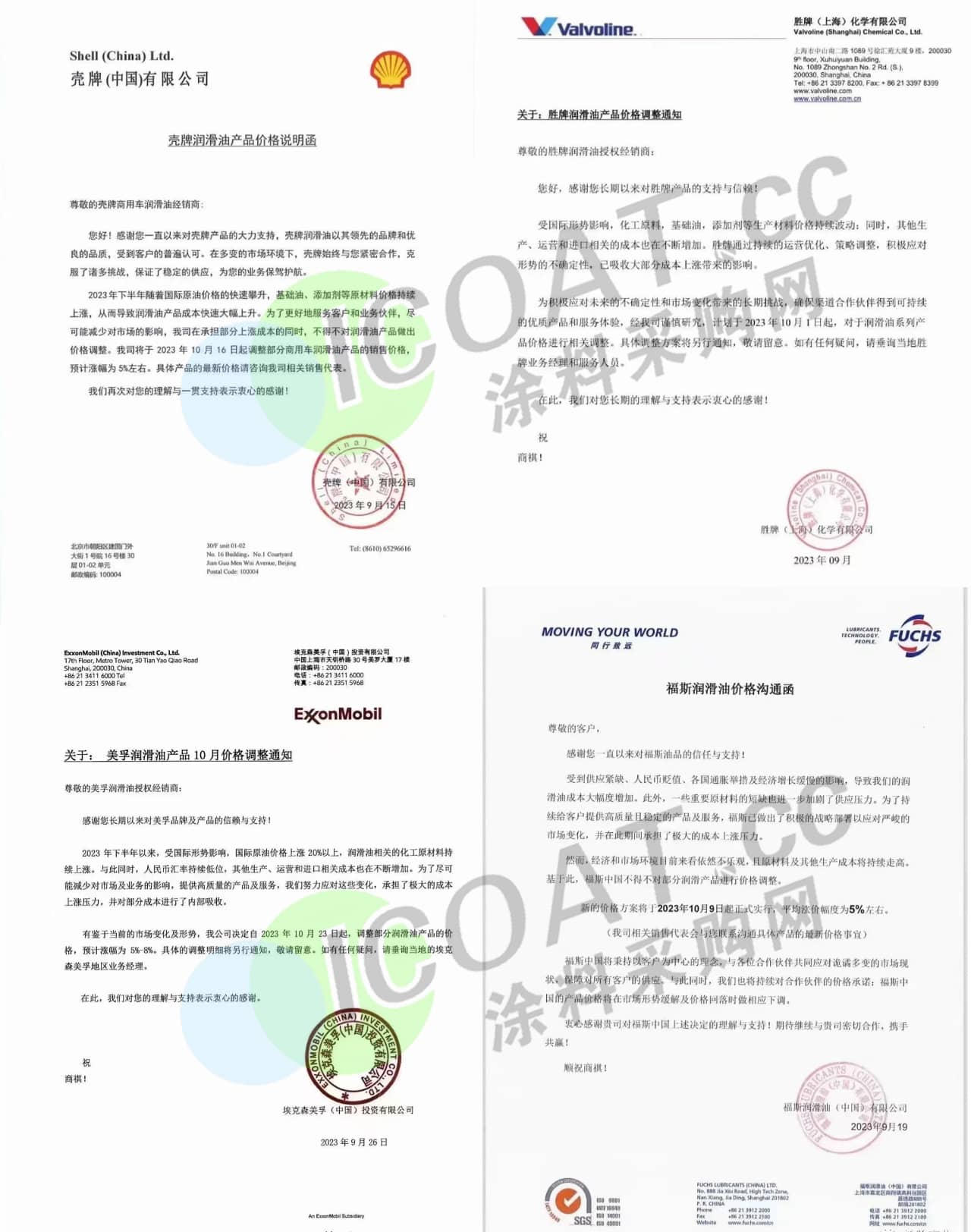 福斯潤滑油:10月9日起實施新價格,平均漲幅5%左右。