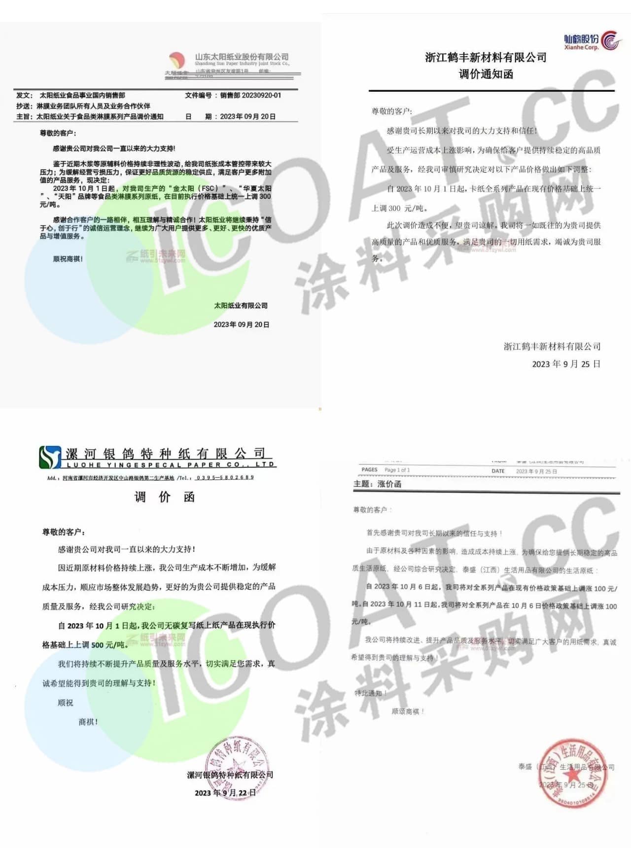 山東太陽紙業:10月1日起,對“金太陽(FSC)”“華夏太陽“天陽”品牌等食品類淋膜系列原紙,在目前執行價格基礎上統一上調300元/噸。