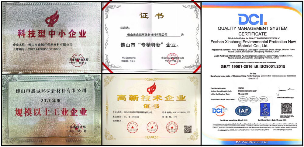 佛山鑫誠是一家集粉末涂料研發、生產、應用于一體的國家高新技術企業,獲得科技型中小企業、專精特新企業、規模以上工業企業、高新技術企業、ISO9001:2015國際管理體系認證企業等多個榮譽稱號。