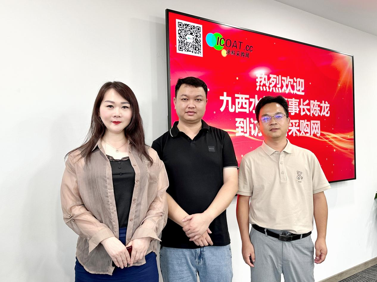 九西水漆董事長(zhǎng)陳龍(中)拜訪涂料采購(gòu)網(wǎng)江雪(左)