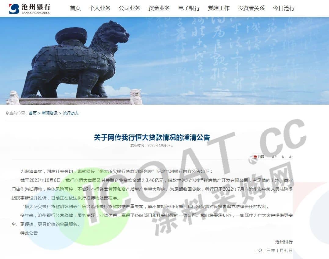 滄州銀行還表示,截至2023年10月6日,滄州銀行向恒大集團(tuán)及其關(guān)聯(lián)企業(yè)貸款金額為3.46億元,借款主體為滄州恒祥房地產(chǎn)開發(fā)有限公司。“為足額收回貸款,我行已于2022年7月向滄州市中級人民法院提起民事訴訟并勝訴,目前正在依法執(zhí)行抵押物處置程序。”盡管不是駭人的34億,但3.4億的貸款也是個天文數(shù)字,滄州銀行已經(jīng)開始走法律程序,表示目前事情不在可商談的范疇,必須“兵戎相見”了。