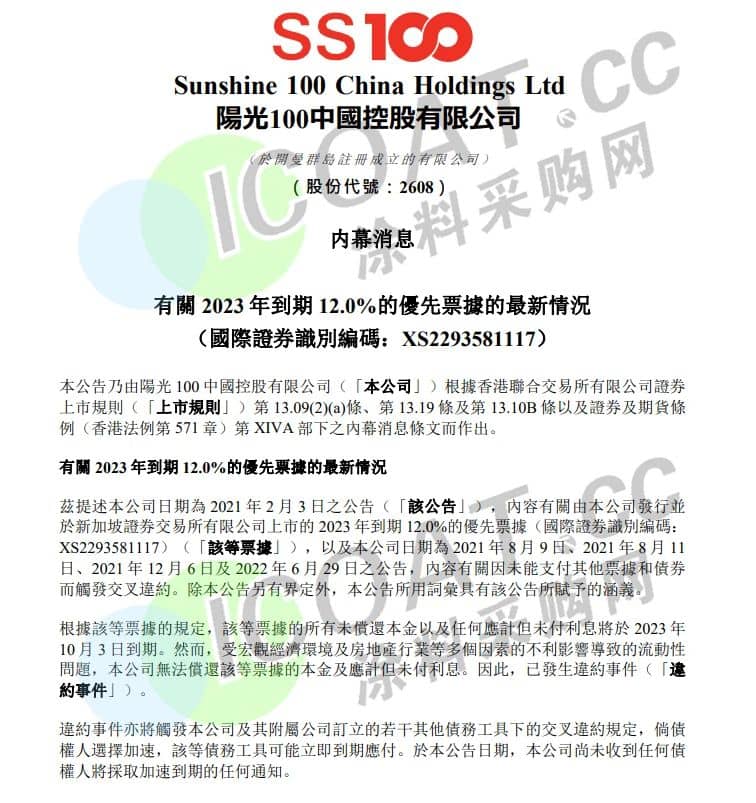 陽光100中國表示,有關(guān)2023年到期12.0%的優(yōu)先票據(jù),所有未償還本金以及任何應(yīng)計但未付利息將于2023年10月3日到期,然而,受房地產(chǎn)行業(yè)等多個因素的不利影響導(dǎo)致的流動性問題,公司無法償還該票據(jù)的本金及應(yīng)計但未付利息,因此已發(fā)生違約事件。