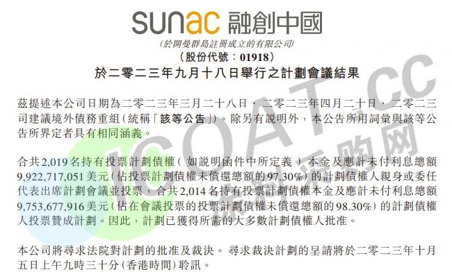 融創(chuàng)中國就美元債重組向美國法庭申請第15章認(rèn)證,以獲得美國法庭對其在香港法庭有關(guān)協(xié)議安排重組的認(rèn)可。此前,9月18日融創(chuàng)中國公告稱,境外債務(wù)重組最終獲得高票通過,共有2019名債權(quán)人投票,債權(quán)人數(shù)通過率為99.75%,債務(wù)總額通過率為98.3%。
