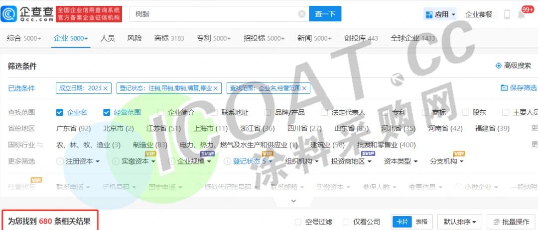 樹脂行業(yè),2023年成立,并于當(dāng)年內(nèi)經(jīng)營范圍變更為注銷/吊銷/撤銷/清算/停業(yè)的企業(yè)超過600家,其中包括樹脂制造、樹脂銷售等經(jīng)營范圍,企業(yè)主要在廣東、浙江、山東、河北、江蘇等地區(qū)。