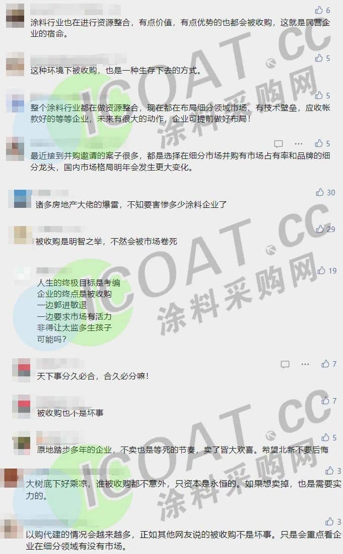 近日,涂料采購(gòu)網(wǎng)報(bào)道民族涂料龍頭嘉寶莉被北新建材收購(gòu)一事,除了一片唏噓之聲外,眾多涂料企業(yè)居然一邊倒的給出了一種輿論,認(rèn)為被收購(gòu)了是明智之舉,不然會(huì)被市場(chǎng)“卷”死。另有不少涂料廠致電本網(wǎng),咨詢賣廠賣股權(quán)事宜,希望能夠及早“賣身”變現(xiàn),抽身離場(chǎng)。另?yè)?jù)民調(diào)得知,百?gòu)?qiáng)涂料企業(yè)中,竟也有20%-30%的企業(yè)曾有過(guò)賣廠的念頭,有些已經(jīng)開始私下運(yùn)作了。