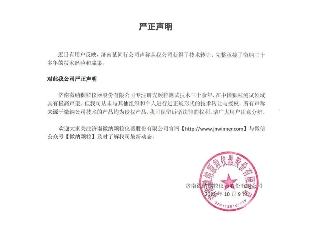 近日,濟(jì)南微納顆粒儀器股份有限公司(以下簡(jiǎn)稱“微納顆粒”)發(fā)布公告聲明稱:從未與其他組織和個(gè)人進(jìn)行過(guò)正規(guī)形式的技術(shù)轉(zhuǎn)讓與授權(quán)。