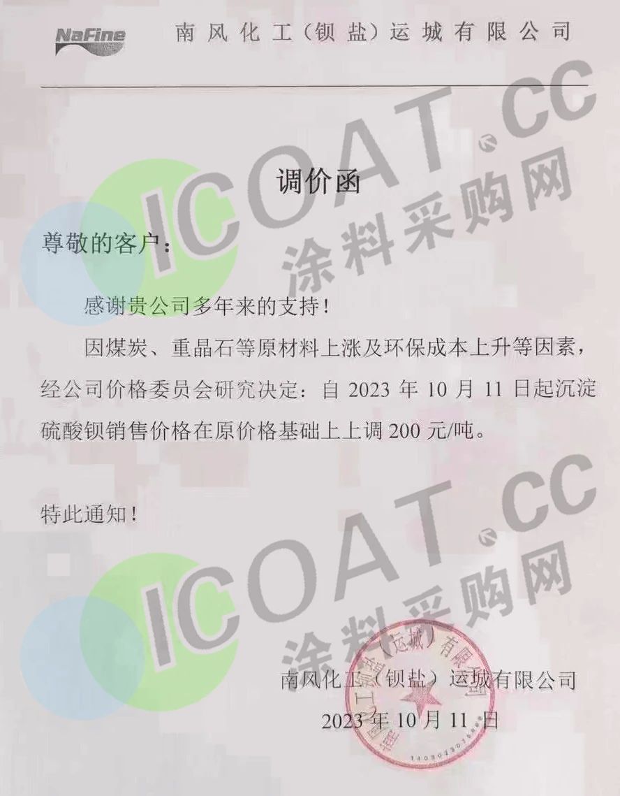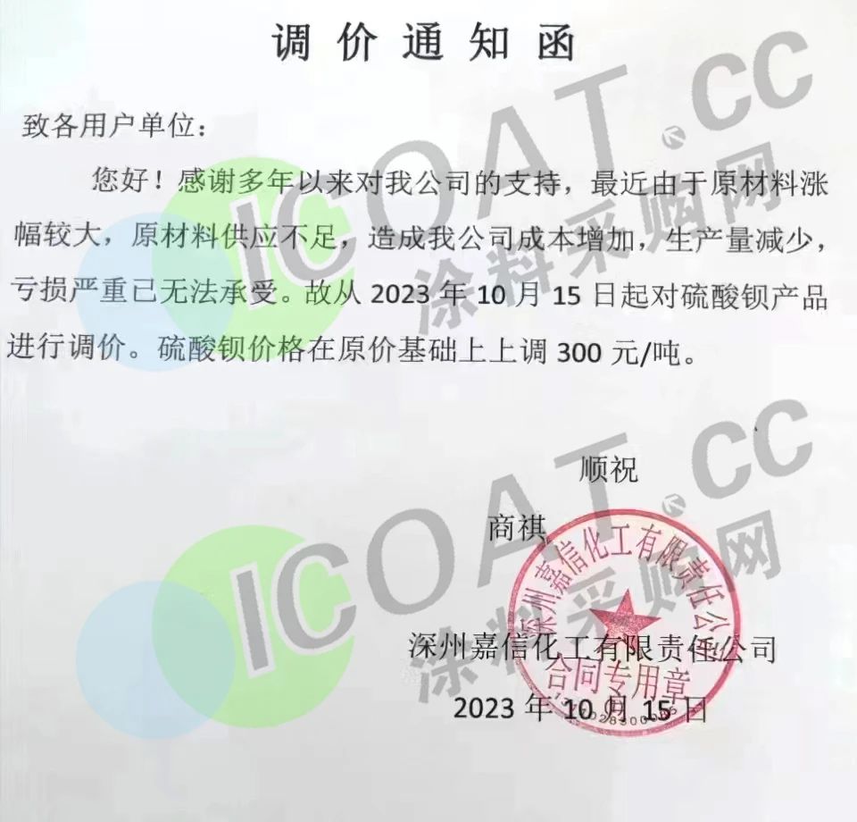 近日,深州嘉信化工發布調價通知函,稱由于原材料漲幅較大,原材料供應不足,造成企業成本增加,生產量減少虧損嚴重已無法承受。故從10月15日起對硫酸鋇產品進行調價,在原價基礎上上調300元/噸。