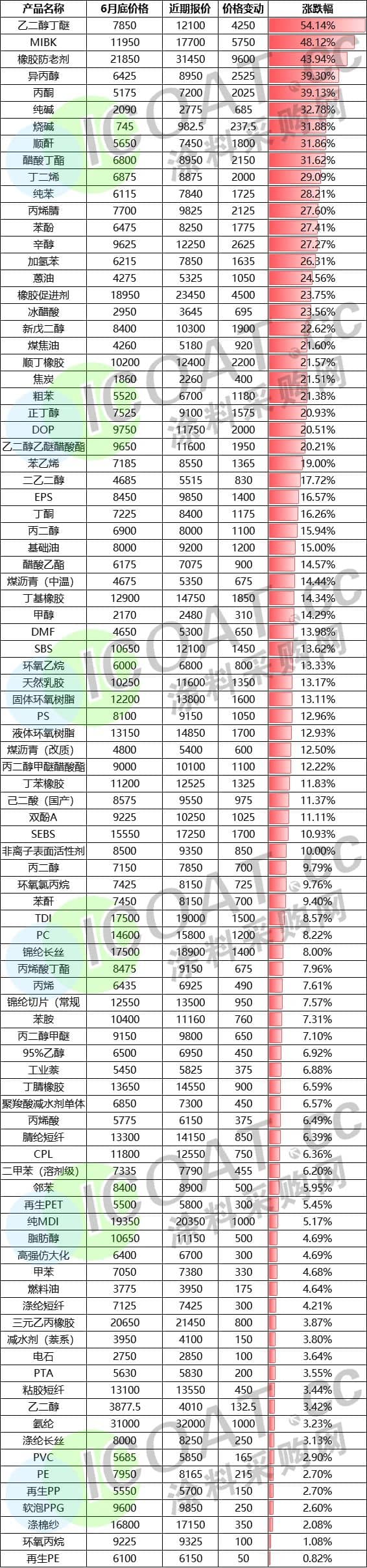 部分化工品下半年價格變動表