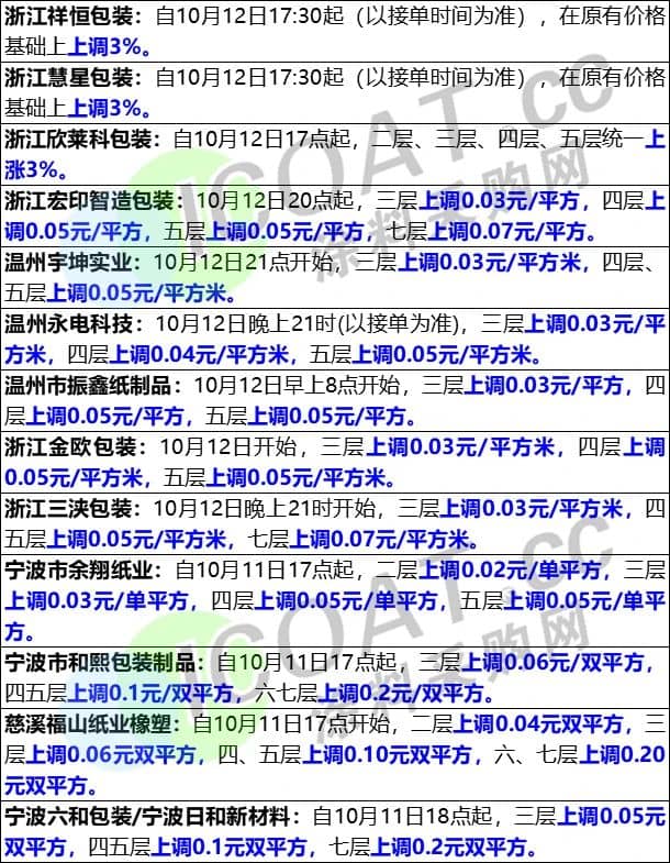 包裝紙市場,玖龍紙業重慶基地、四川基地再度漲價,部分紙種單次上漲力度高達150元/噸。玖牛、海牛、地優、地牛上調50元/噸,地再、江再上調100元/噸,玖瓦、海瓦上調50元/噸,江瓦上調100元/噸,灰底白上調150元/噸。下游紙板市場也持續上調,10月11日-10月12日,華東地區又有大批紙板廠發布漲價函,漲幅在3%左右。