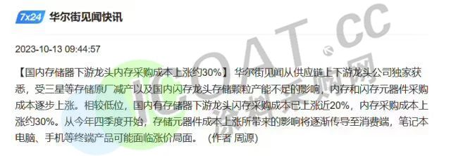 存儲器行業,受三星等存儲原廠減產以及國內閃存龍頭存儲顆粒產能不足的影響,內存和閃存元器件采購成本逐步上漲,相較此前低位,國內有存儲器下游龍頭閃存采購成本已上漲近20%,內存采購成本上漲約30%。