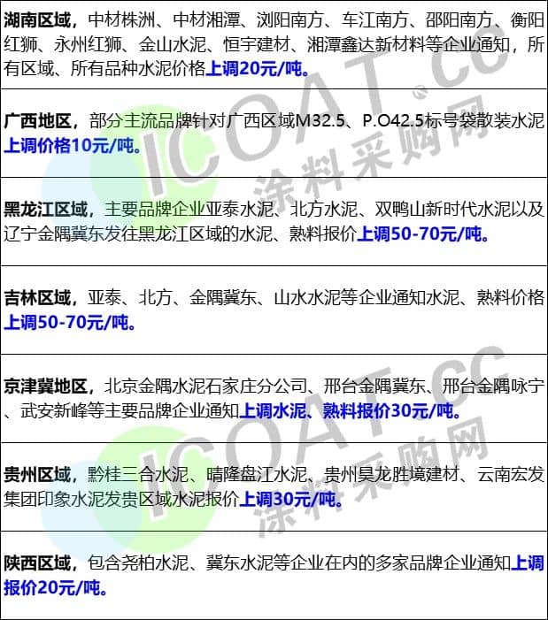 10月中旬以來,云南、貴州、四川、重慶、河北、湖南、陜西、遼寧、吉林、黑龍江、廣西等省市自治區水泥價格恢復性上調。