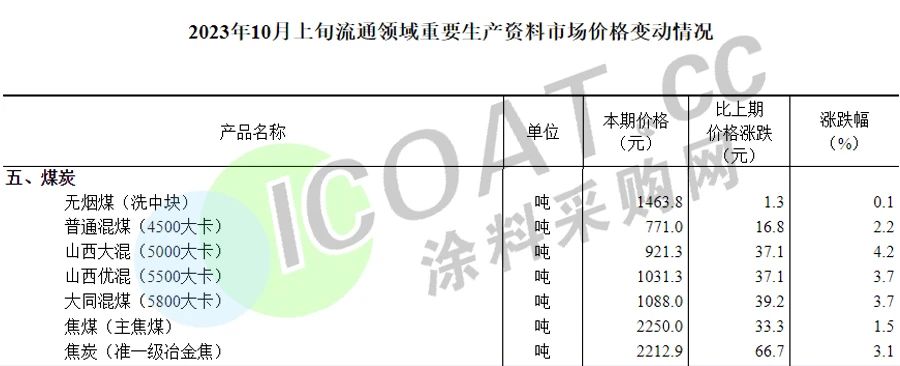 十一假期后,港口煤價連續上漲三天,累計上漲60元/噸。12日,多家焦煤企業通知,焦炭價格上調110元/噸。據國家統計局數據,2023年10月上旬,煤炭價格出現小幅上漲,其中無煙煤(洗中塊)價格同比上漲0.1%,普通混煤(4500大卡)價格同比上漲2.2%,山西大混(5000大卡)價格同比上漲4.2%,山西優混(5500大卡)價格同比上漲3.7%,大同混煤(5800大卡)價格同比上漲3.7%,焦煤(主焦煤)價格同比上漲1.5%,焦炭(準一級冶金焦)價格同比上漲3.1%。