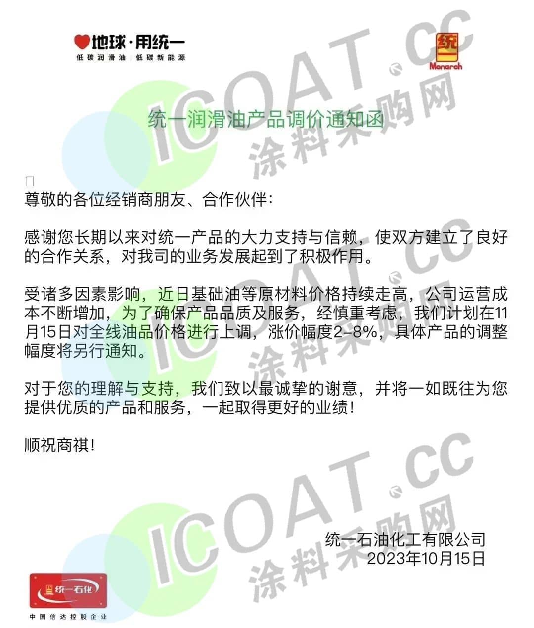 統一潤滑油表示,近日基礎油等原材料價格持續走高,導致公司運營成本不斷增加,為了確保產品品質及服務,計劃在11月15日對全線油品價格進行上調,漲價幅度2-8%,具體產品的調整幅度將另行通知。