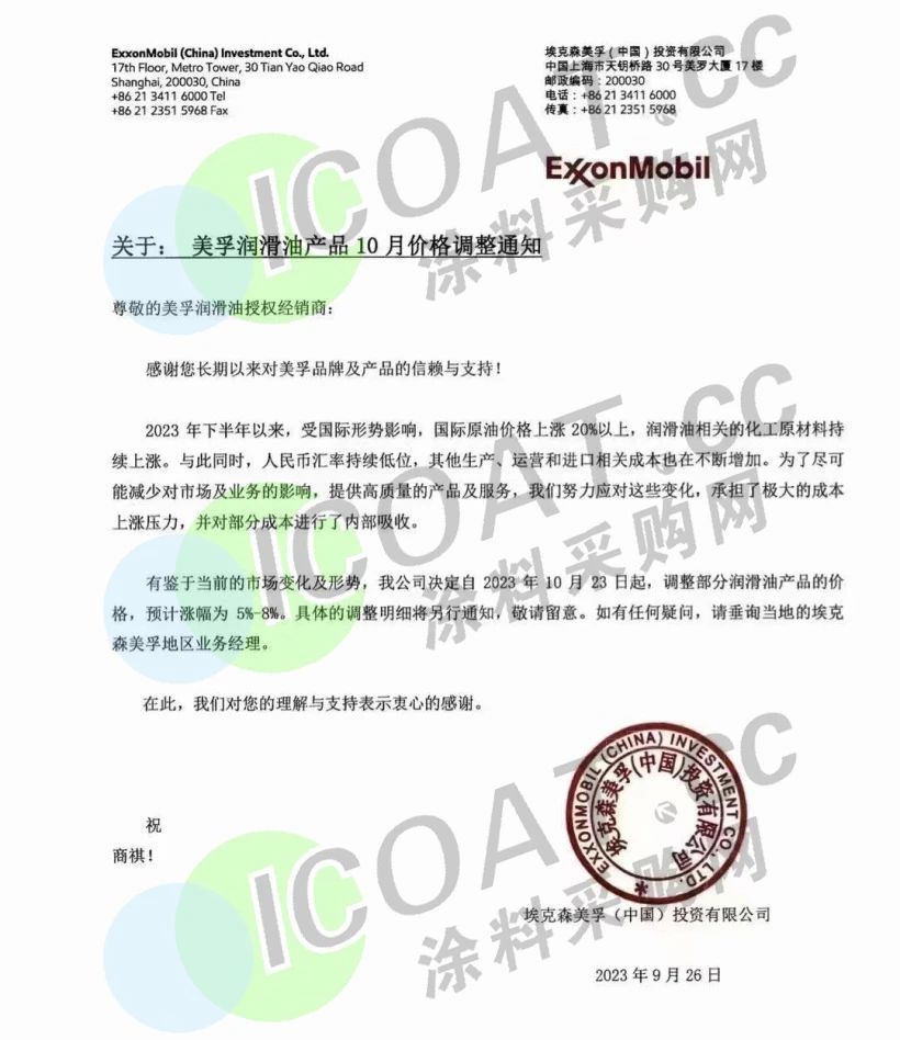 美孚潤滑油表示,自10月23日起,調整部分潤滑油產品的價格,預計漲幅為5%-8%。